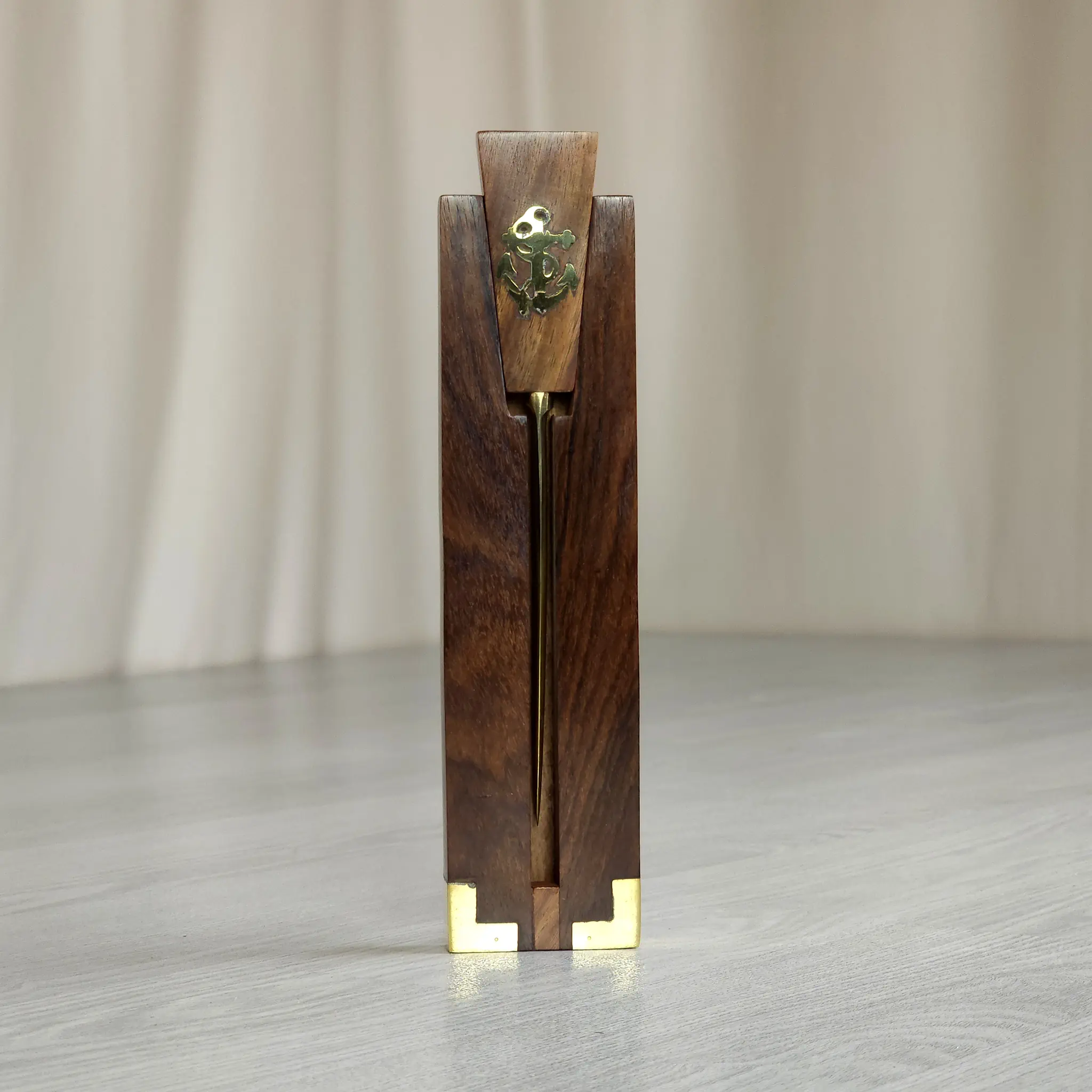 Der Brieföffner ist nicht nur ein schönes Dekorationsobjekt, sondern voll funktionsfähig und für den täglichen Gebrauch konzipiert. Zum Set gehört ein passender Holzständer, der mit Messing-Eckbeschlägen verziert ist und dafür sorgt, dass der Öffner stets griffbereit und stilvoll präsentiert wird. Ein ideales Geschenk für maritime Freunde oder als hochwertige Ergänzung für die eigene Büroausstattung.