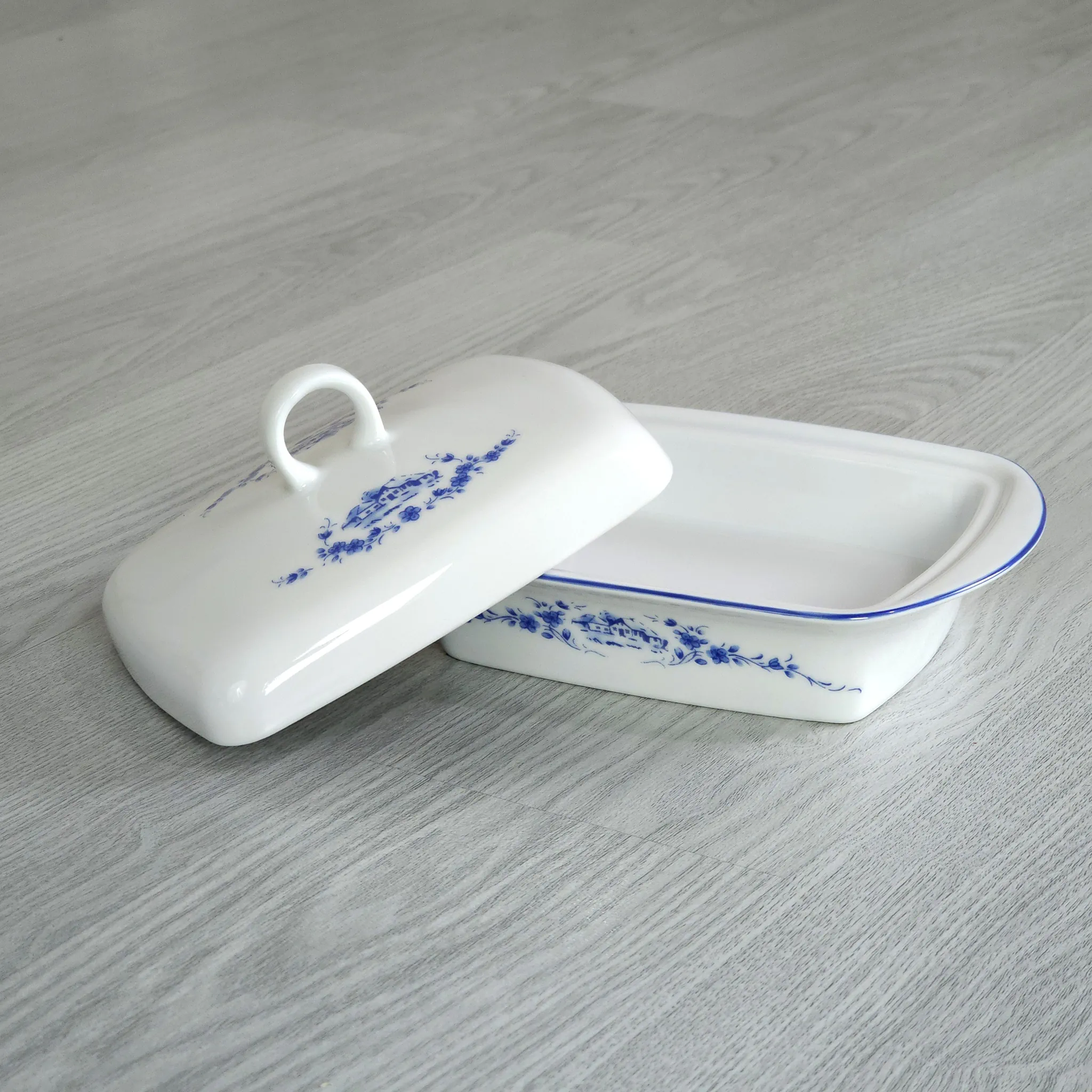 Ergänzen Sie Ihr Frühstücksservice um ein Stück friesische Tradition. Diese wunderschöne Butterdose aus hochwertigem Porzellan besticht durch ihr detailreiches blaues Dekor. Abgebildet ist ein idyllisches Dorfleben mit einer Windmühle, Nebengebäuden und einem Kahn auf einem Kanal.