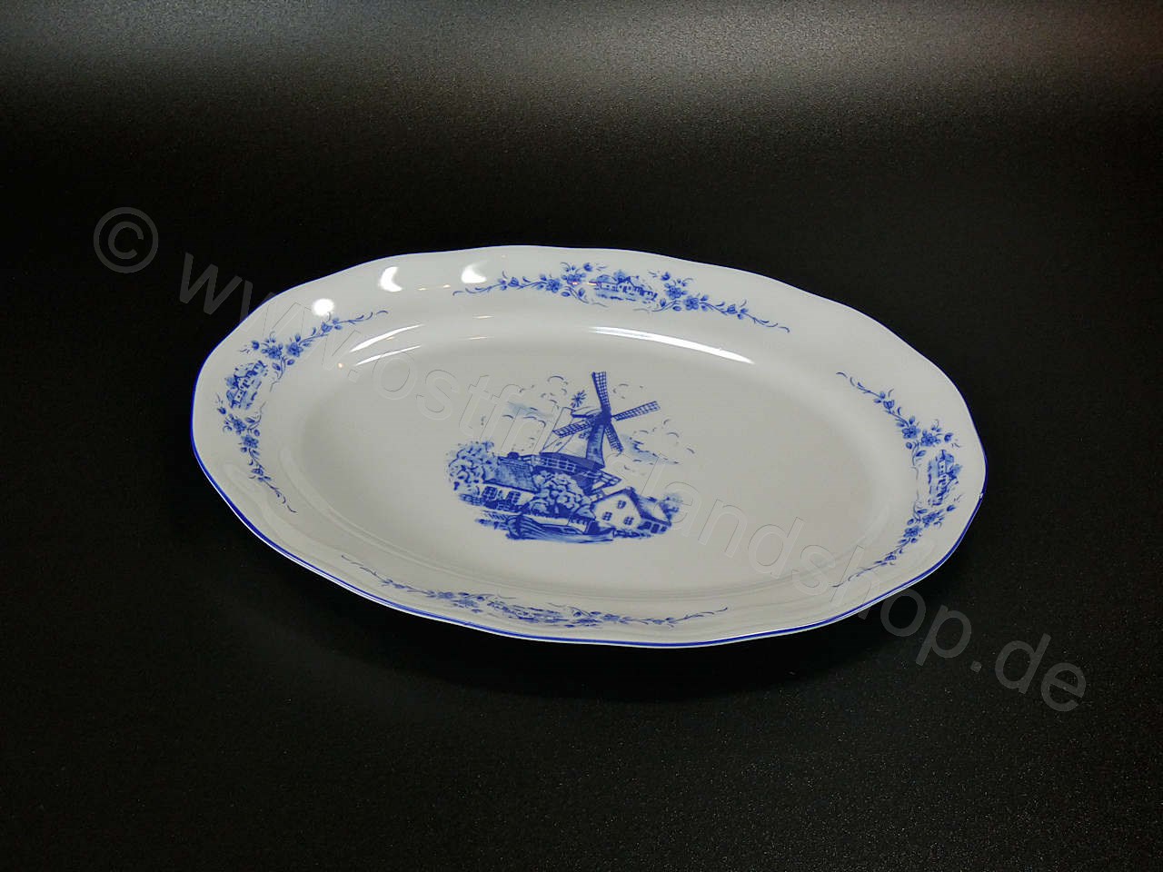 Wunderschönes Porzellan mit einem blauen Dekor welches ein friesisches Dorfleben mit einer Windmühle, Nebengebäuden und einem Kahn auf einem Kanal zeigt. An der Kante ist ein florales Muster mit fein ausgearbeiteten Blumen und einem Friesenhaus zu sehen. Die Form und Ausführung ist ähnlich wie bei Porzellan aus alten Zeiten traditionell leicht wellig ausgeführt. Dieses Porzellan ist Spülmaschinenfest und kann auch in der Mikrowelle benutzt werden. Wir bieten Ihnen hier die Fleischplatte oder Gemüseplatte klein in der Grösse von ca. 23x15 cm oval an.