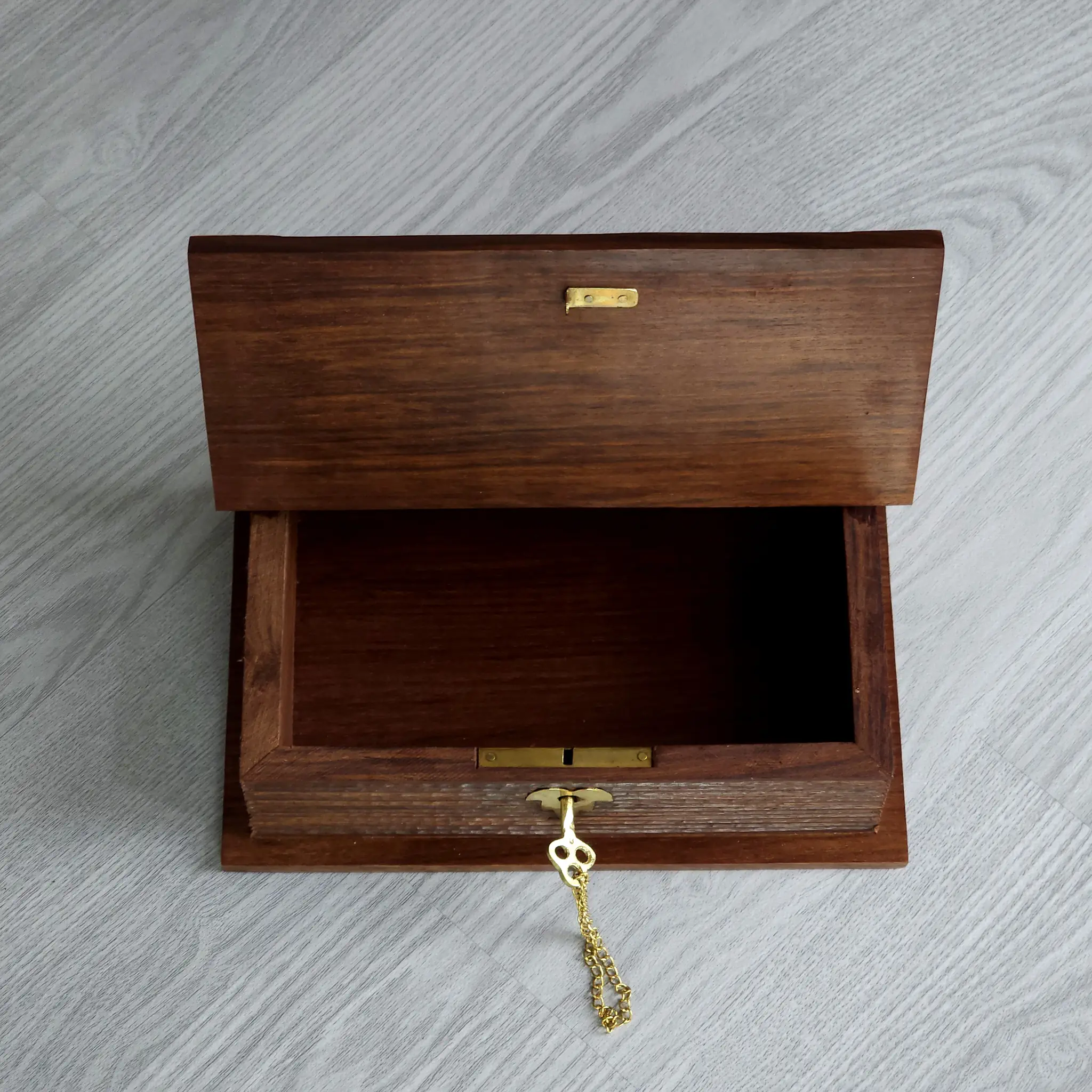 Diese kunstvoll gefertigte Holzbox vereint Funktionalität mit einem außergewöhnlichen Design in Form eines klassischen Buches. Die Box besticht durch ihre detaillierten Messing-Applikationen, wie den Anker auf dem Buchdeckel und die verzierten Kantenbeschläge. Besonders hervorzuheben ist die seitliche Gestaltung: Durch abgestufte Holzschichten wird der optische Eindruck von echten Buchseiten erzeugt.