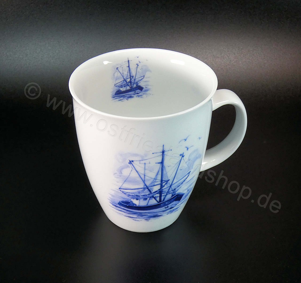 Der Becher mit Kutter und einem Kutter in der Tasse ist aus Porzellan, hat eine Höhe von ca. 11 cm und Oben einen Durchmesser von ca. 9,5cm. Inhalt ca. 400ml.