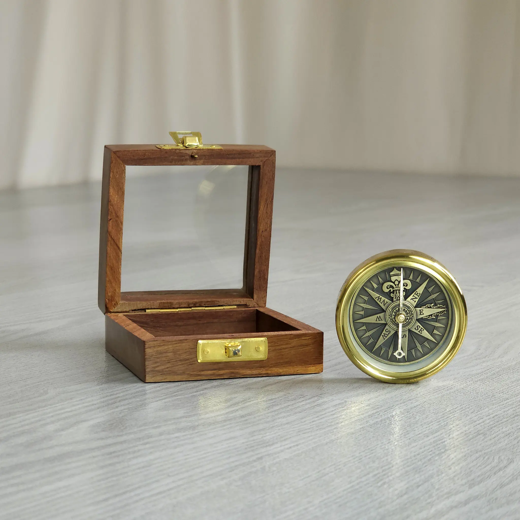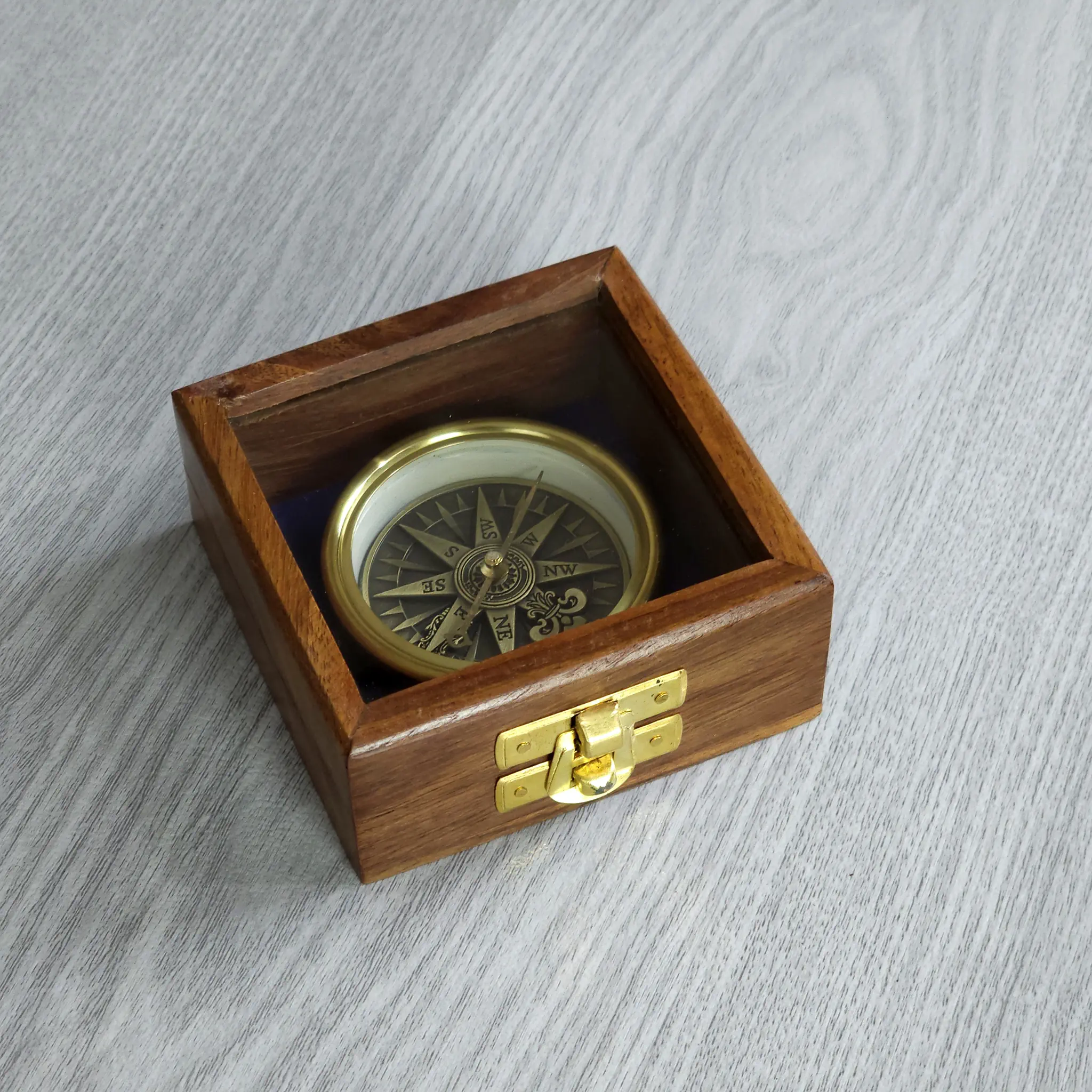 Der Kompass ist voll funktionsfähig und aus robustem Messing gefertigt. Er dient nicht nur als präzises Navigationsinstrument, sondern ist auch ein hervorragendes Geschenk für Freunde der Seefahrt oder eine stilvolle Dekoration für Ihre Räumlichkeiten. Zum Lieferumfang gehört eine passende, quadratische Holzbox mit einem praktischen Glassichtfenster im Deckel, in der der Kompass sicher aufbewahrt und gleichzeitig präsentiert werden kann.