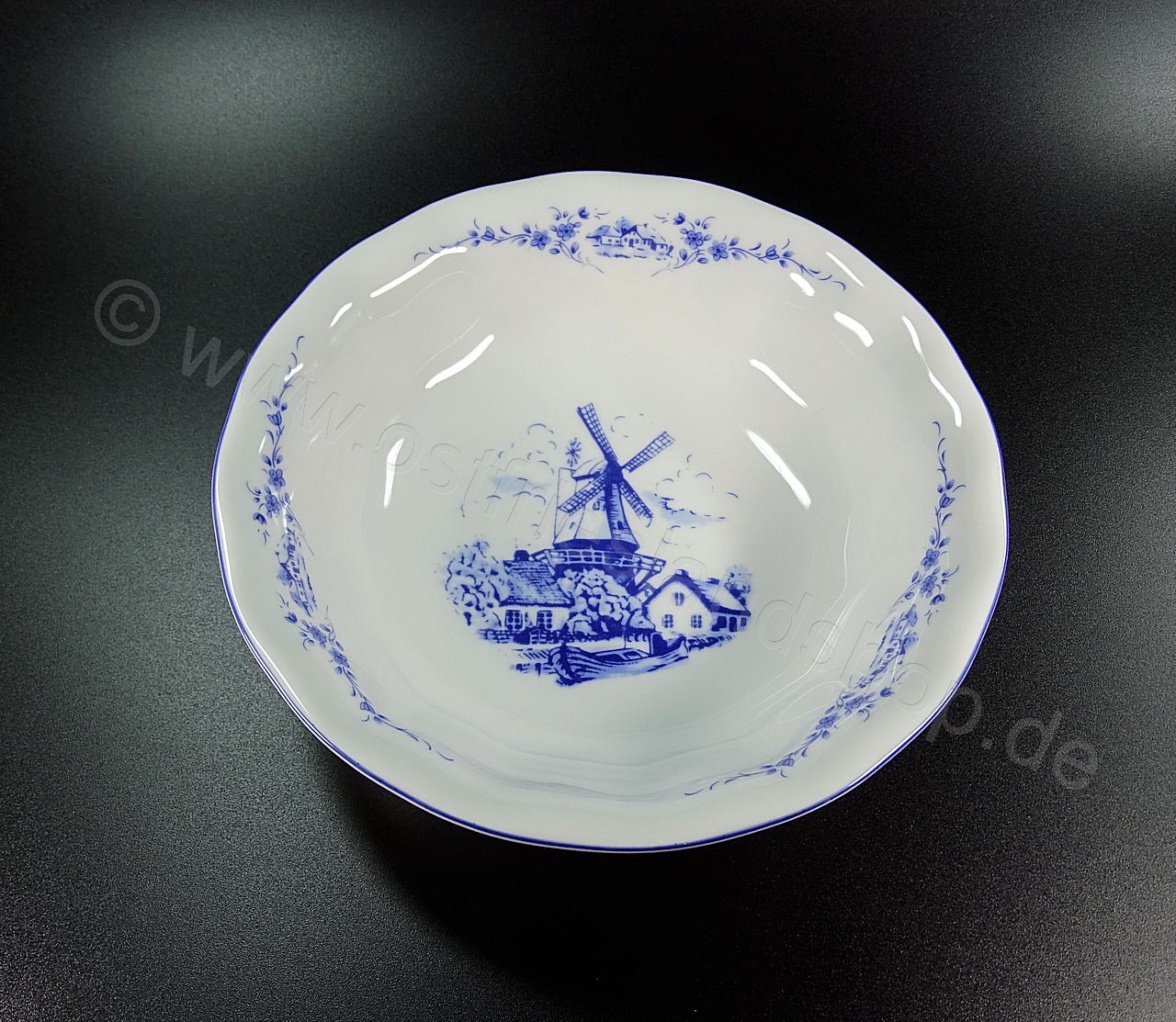 Wunderschönes Porzellan mit einem blauen Dekor welches ein friesisches Dorfleben mit einer Windmühle, Nebengebäuden und einem Kahn auf einem Kanal zeigt. An der Kante ist ein florales Muster mit fein ausgearbeiteten Blumen und einem Friesenhaus zu sehen. Die Form und Ausführung ist ähnlich wie bei Porzellan aus alten Zeiten traditionell leicht wellig ausgeführt. Dieses Porzellan ist Spülmaschinenfest und kann auch in der Mikrowelle benutzt werden. Wir bieten Ihnen hier die Kompottschale / Salatschüssel mit einem Durchmesser von ca. 13 cm an.