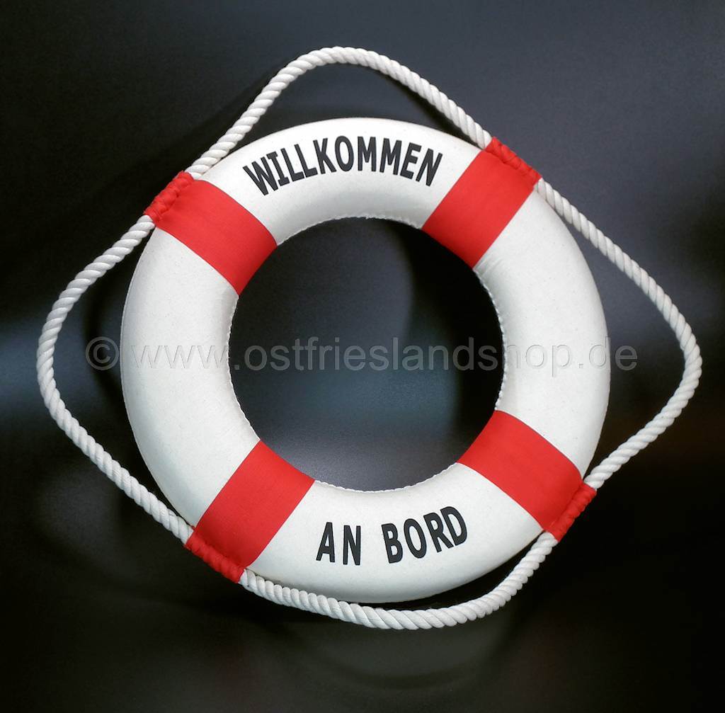 Rettungsring in der bekannten zweifarbigen Optik. Ein sehr schönes Dekorationsstück. Der Ring besteht aus Styropor der mit Stoff überzogen ist. Auf dem Ring ist der Aufdruck Willkommen an Bord' angebracht. Eine Kordel ist umlaufend fest angenäht. Lieferbar in 2 Farben und in drei Grössen. Dieser Rettungsring ist nicht als zugelassenes Rettungsgerät zertifiziert und kann somit nicht als Rettungsgerät eingesetzt werden'.