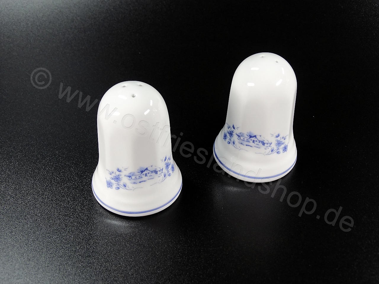 Wunderschönes Porzellan mit einem blauen Dekor welches ein friesisches Dorfleben mit einer Windmühle, Nebengebäuden und einem Kahn auf einem Kanal zeigt. An der Kante ist ein florales Muster mit fein ausgearbeiteten Blumen und einem Friesenhaus zu sehen. Die Form und Ausführung ist ähnlich wie bei Porzellan aus alten Zeiten traditionell leicht wellig ausgeführt. Dieses Porzellan ist Spülmaschinenfest und kann auch in der Mikrowelle benutzt werden. Wir bieten Ihnen hier die Salz und Pfefferstreuer an.