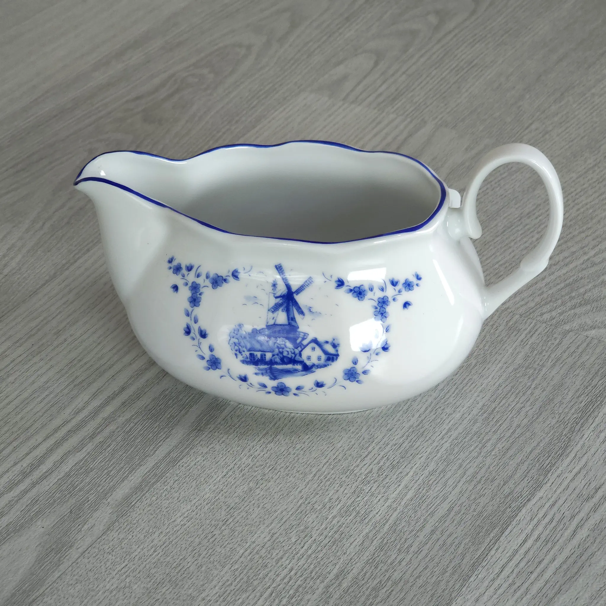 Ergänzen Sie Ihre Tafel um ein Stück echte friesische Tradition. Diese wunderschöne Sauciere aus hochwertigem Porzellan besticht durch ihr detailreiches blaues Dekor, das ein idyllisches Dorfleben mit einer Windmühle, Nebengebäuden und einem Kahn auf einem Kanal darstellt. Der Rand ist mit einem feinen floralen Muster und einem typischen Friesenhaus veredelt.