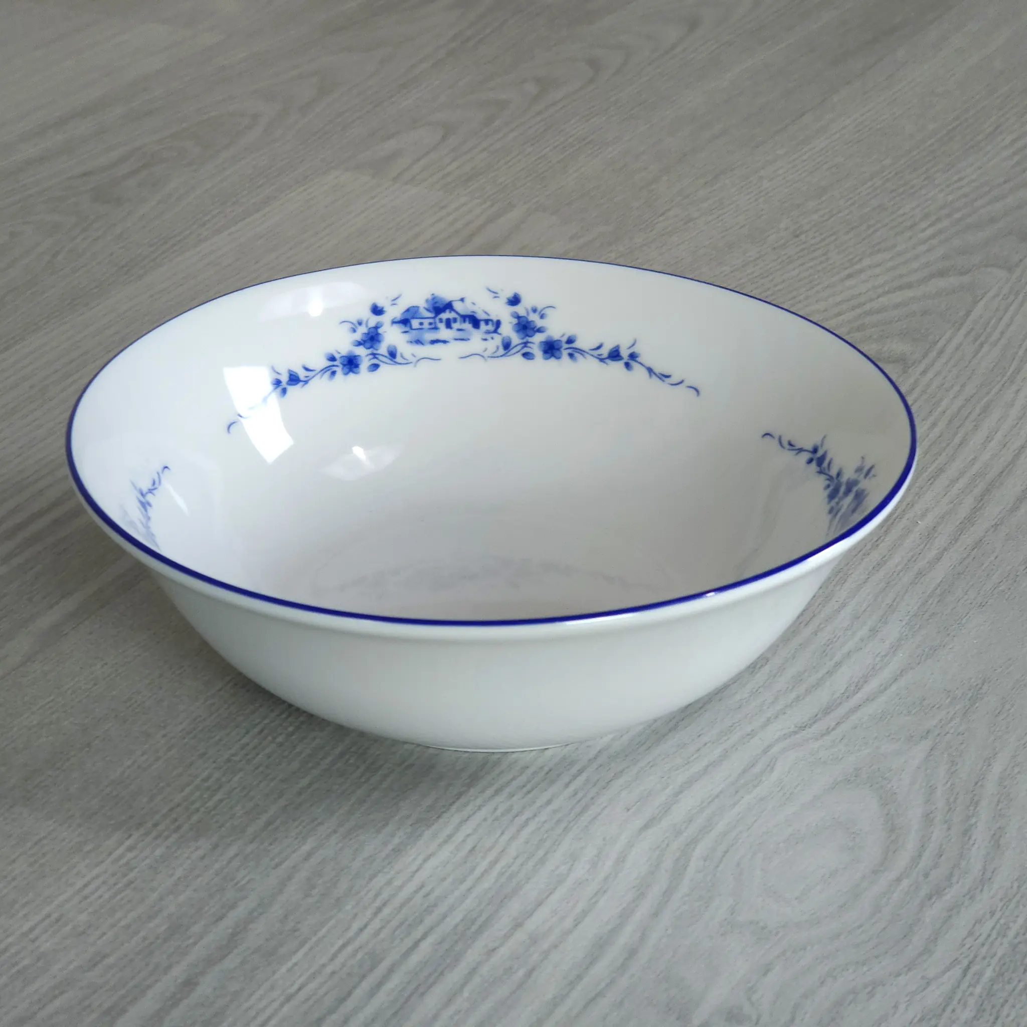 Die Form und Ausführung ist traditionell leicht wellig gehalten und erinnert an klassisches Porzellan aus alten Zeiten. Trotz der nostalgischen Optik ist die Schüssel absolut alltagstauglich, da sie spülmaschinenfest und mikrowellengeeignet ist. Mit einem Durchmesser von ca. 25 cm eignet sie sich hervorragend als Salatschüssel oder zum Servieren von Beilagen.