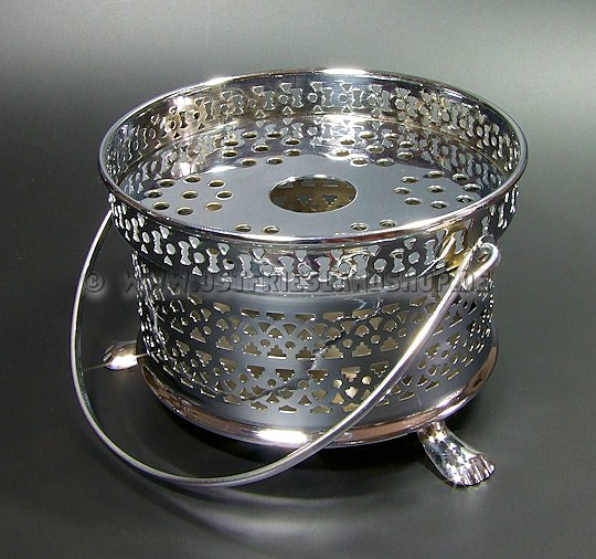 Sehr schönes Teestövchen / sehr schöner Teewärmer in Messing verchromter sehr hochwertiger Ausführung mit Bügelgriff in einer wunderschönen neutralen klassischen Optik und dadurch passend zu jedem Porzellan oder Geschirr. Ein Stövchen mit einem herrlichen Aussehen das jede Teetafel verschönert. Besonders hübsch sieht es bei leicht abgedunkelten Zimmer aus, da dann das flackernde Licht des Teelichtes wunderbare Lichtspiele durch die Öffnungen des Stövchens erzeugt. Durch die hochwertige Verarbeitung ist dieses Stövchen für den täglichen Gebrauch ebenso geeignet wie zur Nutzung auf dem festlich gedeckten Tisch. Ein Stövchen das jede Teestunde zu einem ganz besonders schönen Anlass werden lässt. Durchmesser ca. 15,5 cm mit einer Höhe von ca. 10 cm.