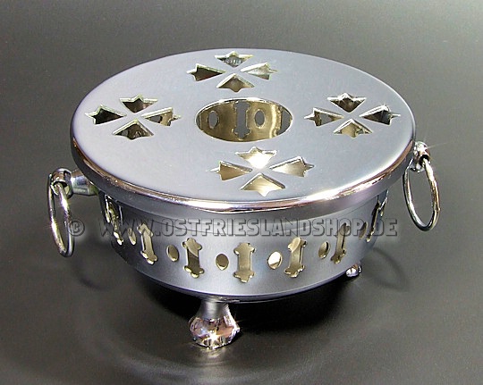 Sehr schönes Teestövchen / sehr schöner Teewärmer in Messing verchromter Ausführung mit Füssen und Henkeln in einer absolut neutralen klassischen Optik und dadurch passend zu jedem Porzellan oder Geschirr. Ein Stövchen mit einem herrlichen Aussehen das jede Teetafel verschönert. Besonders hübsch sieht es bei leicht abgedunkelten Zimmer aus, da dann das flackernde Licht des Teelichtes wunderbare Lichtspiele durch die Öffnungen des Stövchens erzeugt. Durch die hochwertige Verarbeitung ist dieses Stövchen für den täglichen Gebrauch ebenso geeignet wie zur Nutzung auf dem festlich gedeckten Tisch. Durchmesser ca. 11,5 cm mit einer Höhe von ca. 6,5 cm.