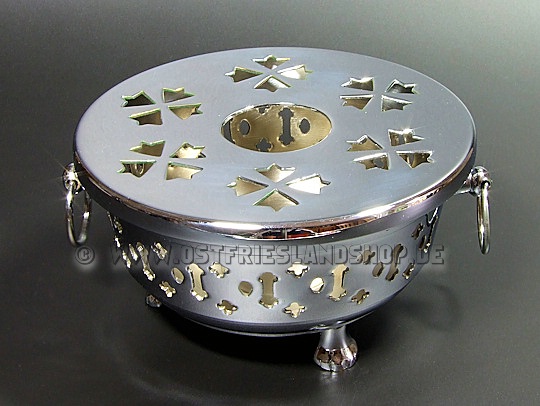 Sehr schönes Teestövchen / sehr schöner Teewärmer in Messing verchromter Ausführung mit Füssen und Henkeln in einer absolut neutralen klassischen Optik und dadurch passend zu jedem Porzellan oder Geschirr. Ein Stövchen mit einem herrlichen Aussehen das jede Teetafel verschönert. Besonders hübsch sieht es bei leicht abgedunkelten Zimmer aus, da dann das flackernde Licht des Teelichtes wunderbare Lichtspiele durch die Öffnungen des Stövchens erzeugt. Durch die hochwertige Verarbeitung ist dieses Stövchen für den täglichen Gebrauch ebenso geeignet wie zur Nutzung auf dem festlich gedeckten Tisch. Durchmesser ca. 13,5 cm mit einer Höhe von ca. 7,5 cm.