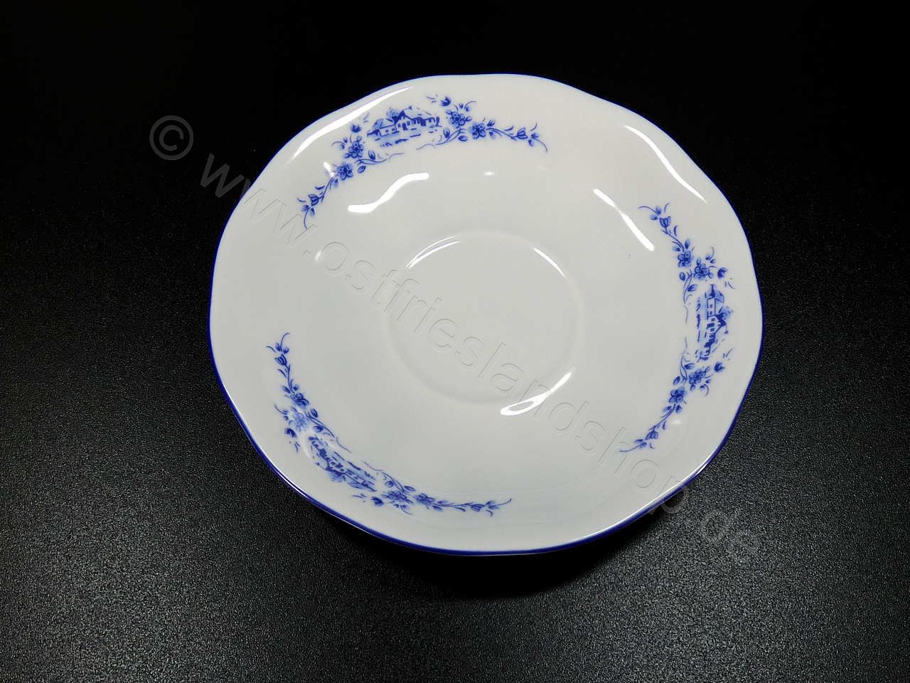 Wunderschönes Porzellan mit einem blauen Dekor welches ein friesisches Dorfleben mit einer Windmühle, Nebengebäuden und einem Kahn auf einem Kanal zeigt. An der Kante ist ein florales Muster mit fein ausgearbeiteten Blumen und einem Friesenhaus zu sehen. Die Form und Ausführung ist ähnlich wie bei Porzellan aus alten Zeiten traditionell leicht wellig ausgeführt. Dieses Porzellan ist Spülmaschinenfest und kann auch in der Mikrowelle benutzt werden. Wir bieten Ihnen hier die Untertasse passend für die Kaffeetasse 0,2 Liter an. Durchmesser ca. 14,5 cm.