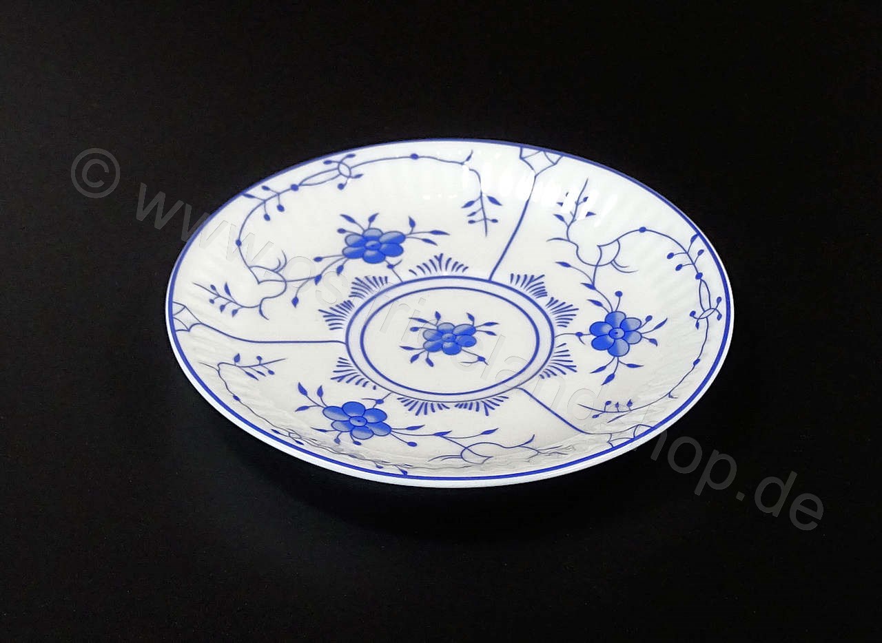 Das August Warnecke Dekor Friesisch Blau auch Dresmer Blau genannt. Das Motiv Alter Kakiemon' Deko zeigt sich in verschlungenen Linien mit kleinen, blauen Blüten auf weißem gerippten Grund.