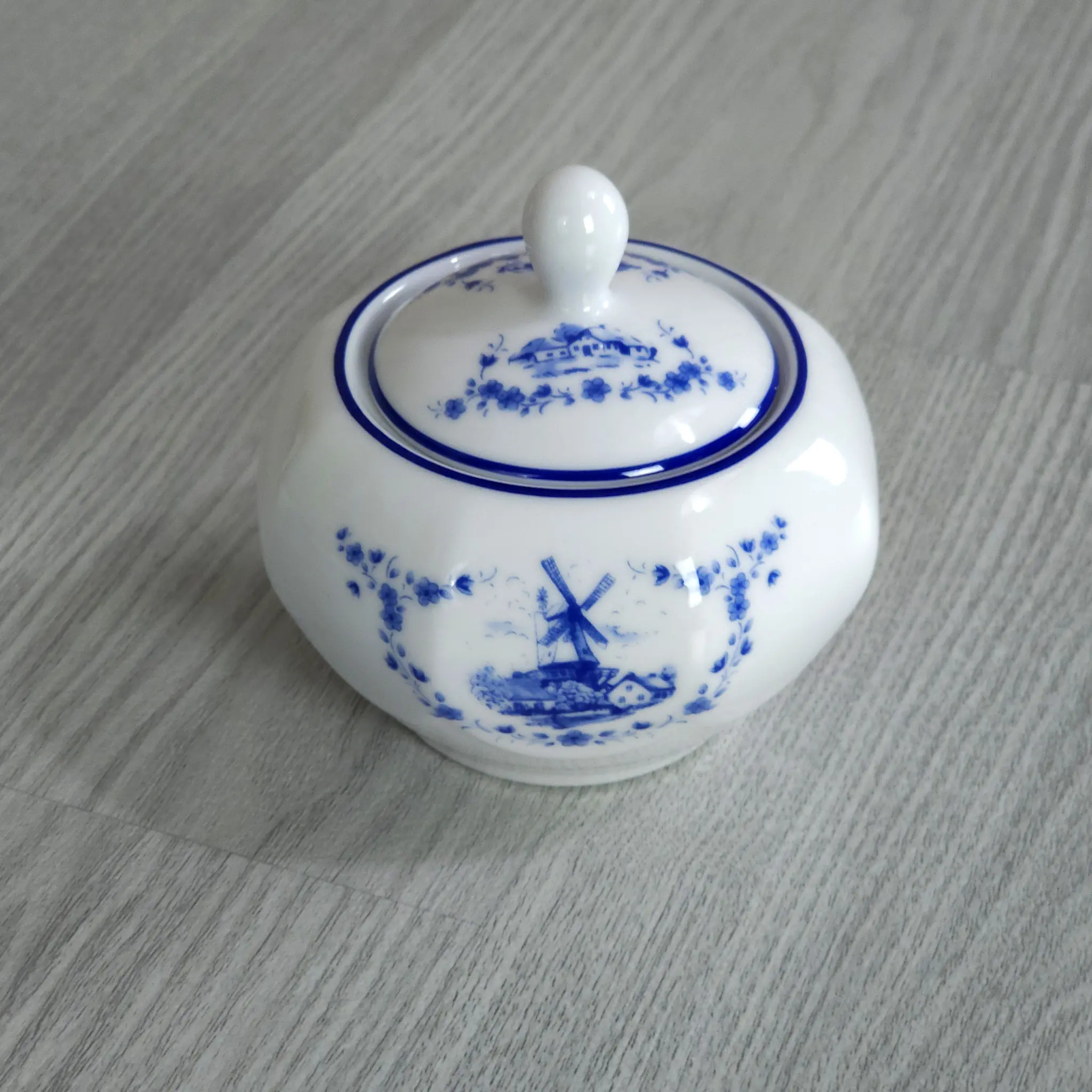 Vervollständigen Sie Ihr Service um ein Stück echte friesische Tradition. Diese wunderschöne Zuckerdose aus Porzellan besticht durch ihr detailreiches blaues Dekor, das ein idyllisches Dorfleben mit Windmühle, Nebengebäuden und einem Kahn auf dem Kanal darstellt. Der Rand ist mit einem feinen floralen Muster und einem typischen Friesenhaus veredelt.